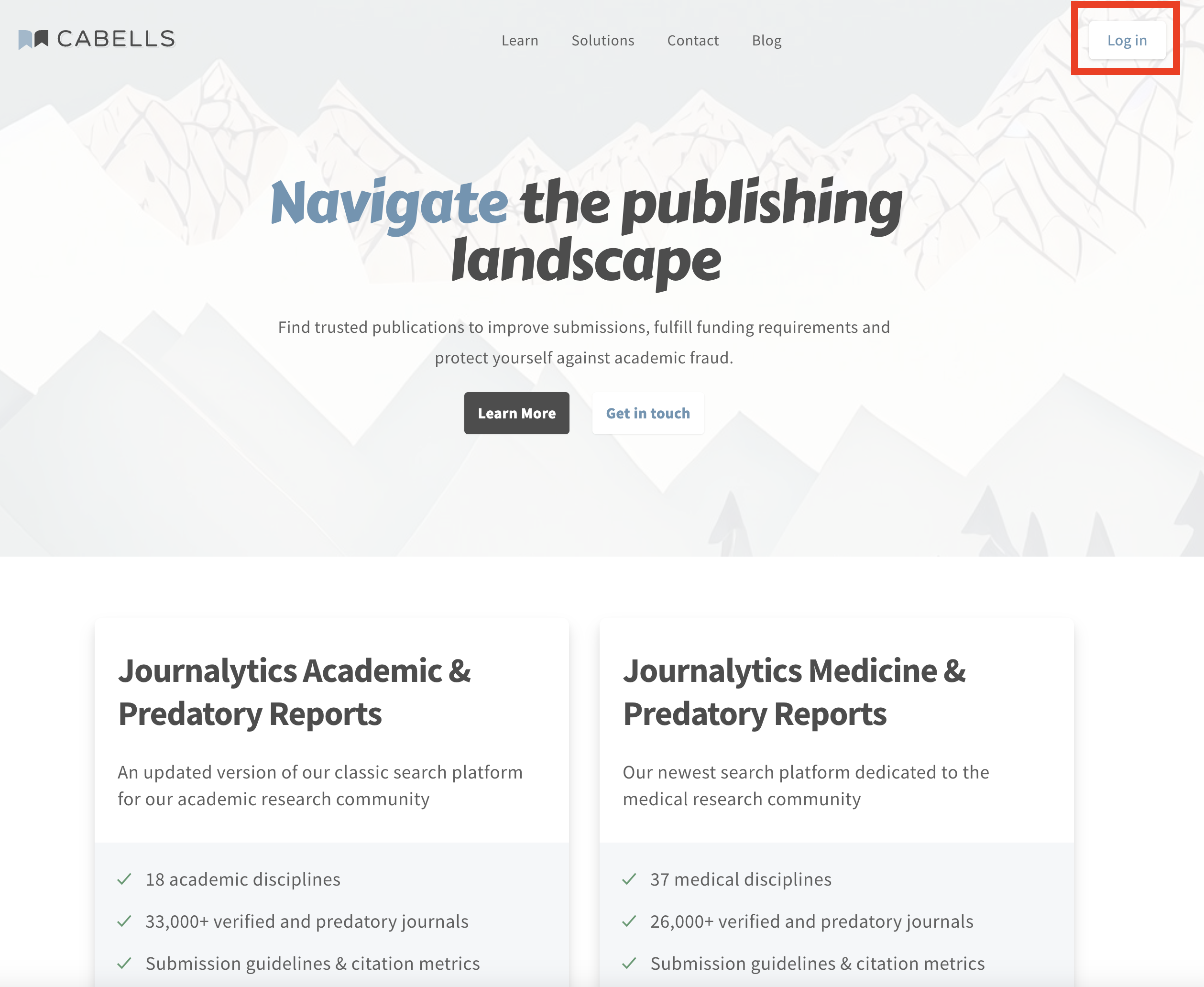 3. From the Cabells homepage, click the Log in button on the upper right portion of the screen.