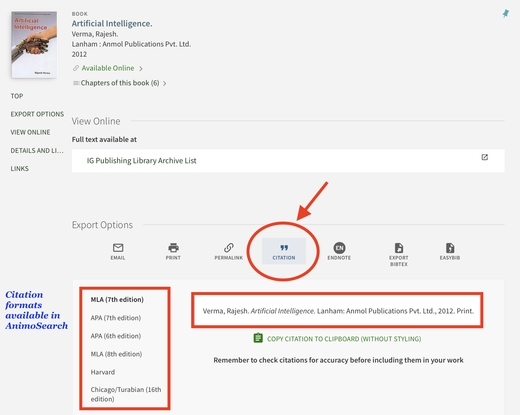 Citing a Resource - to cite a resource, click on the Citation tool. Various citation formats will be shown, select the one that best fits your research and copy it to your clipboard.