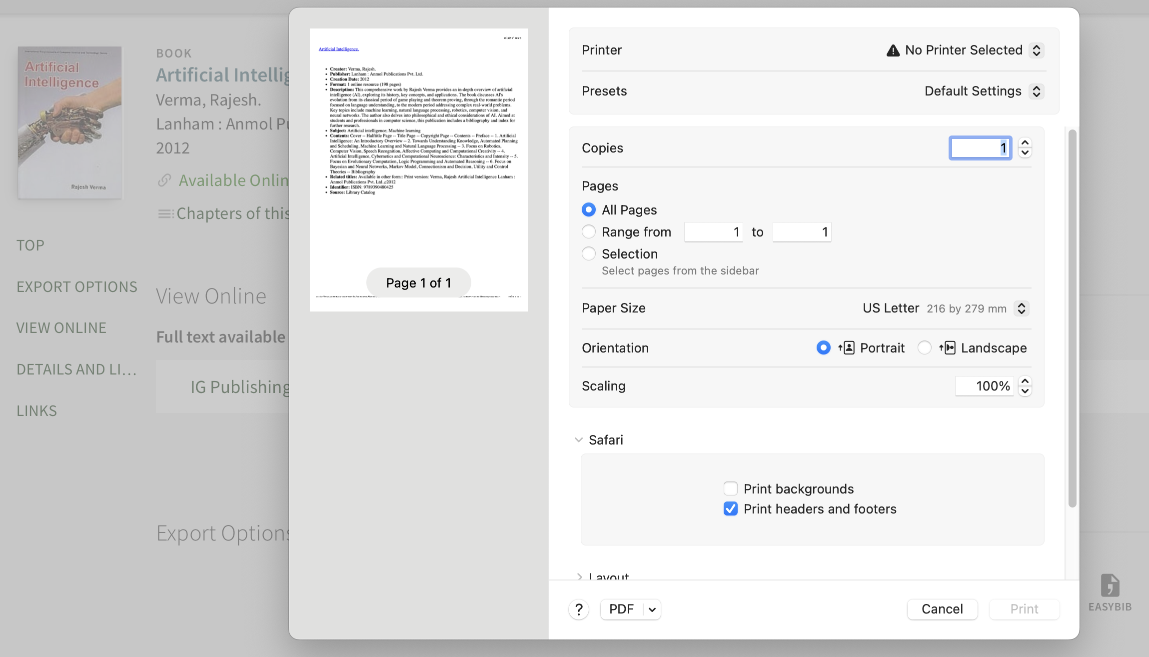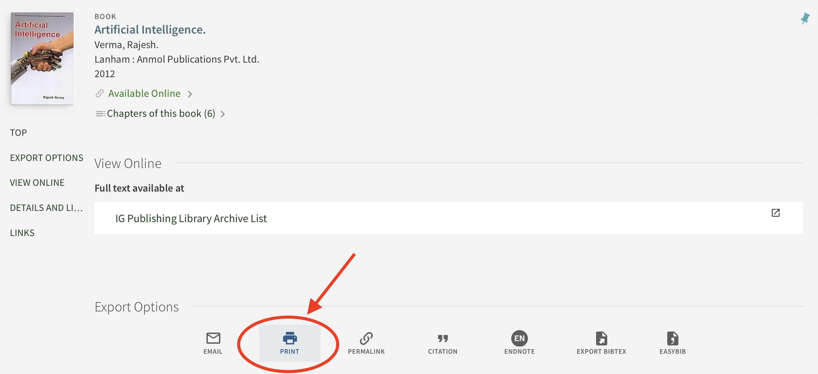 Printing Metadata - to print an item's metadata, click on Print. You can either print it directly or save the file to your device.